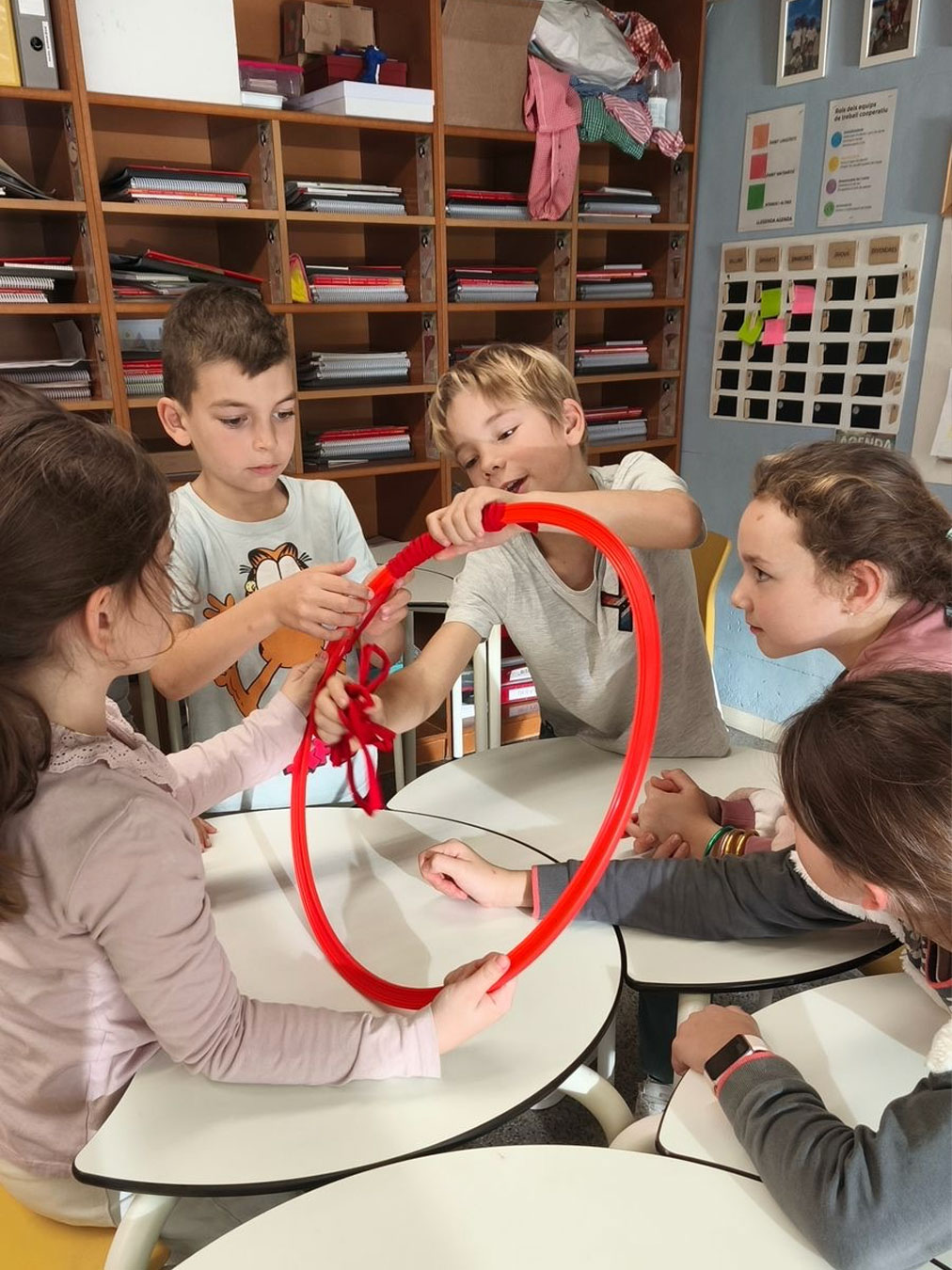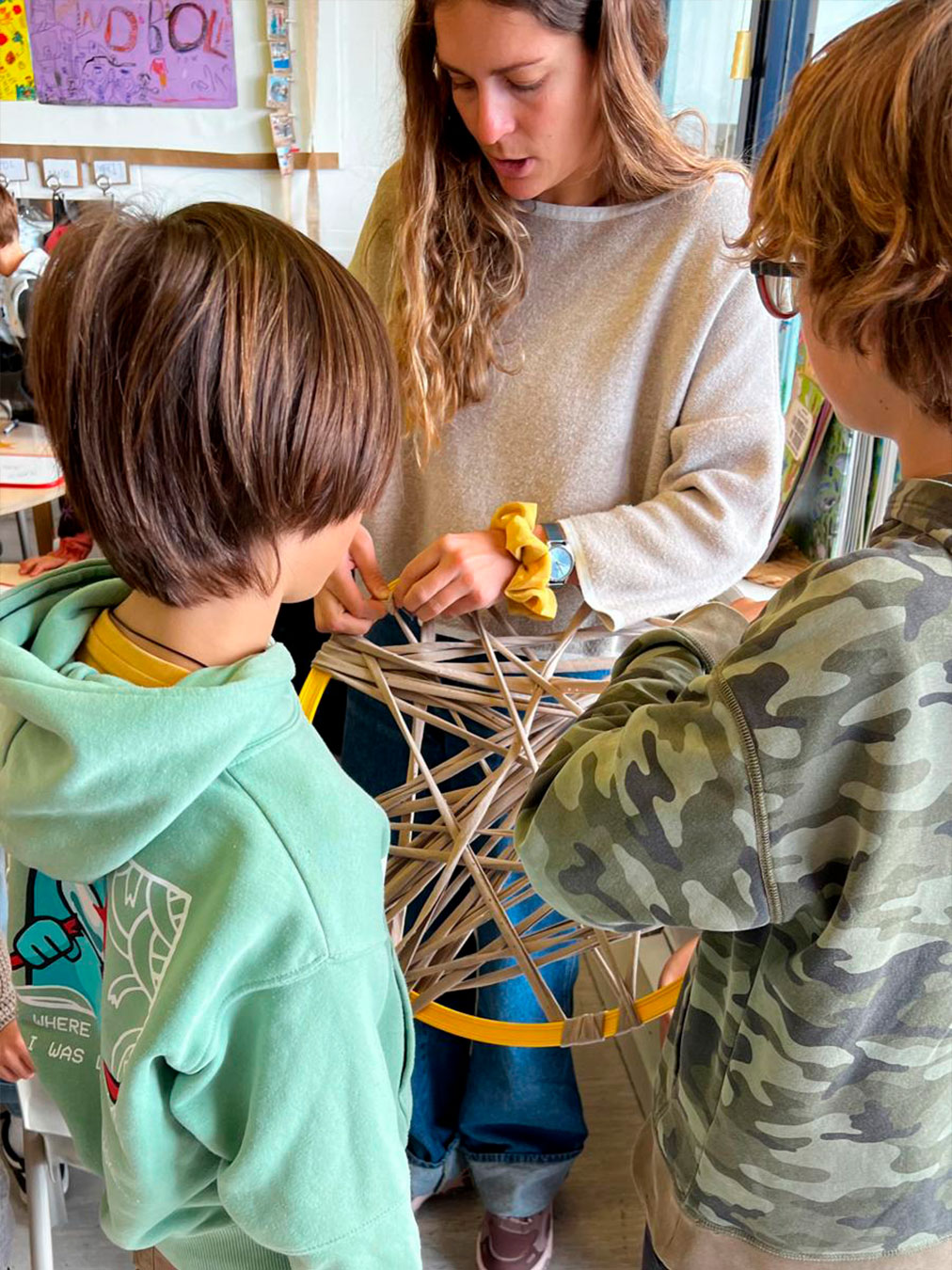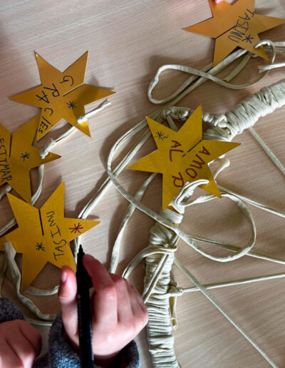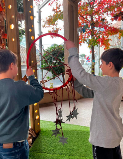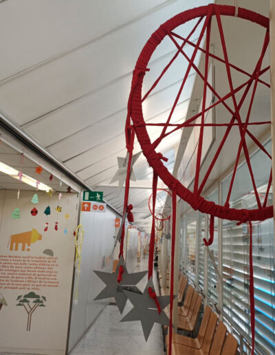 Els atrapa-somnis estan formats per cèrcols de plàstic embolcallats amb roba de colors nadalencs i amb una xarxa geomètrica senzilla al centre. A la part inferior, hi pengen estrelles on l’alumnat pot escriure missatges simbòlics, paraules d’ànim o dibuixos plens d’afecte.